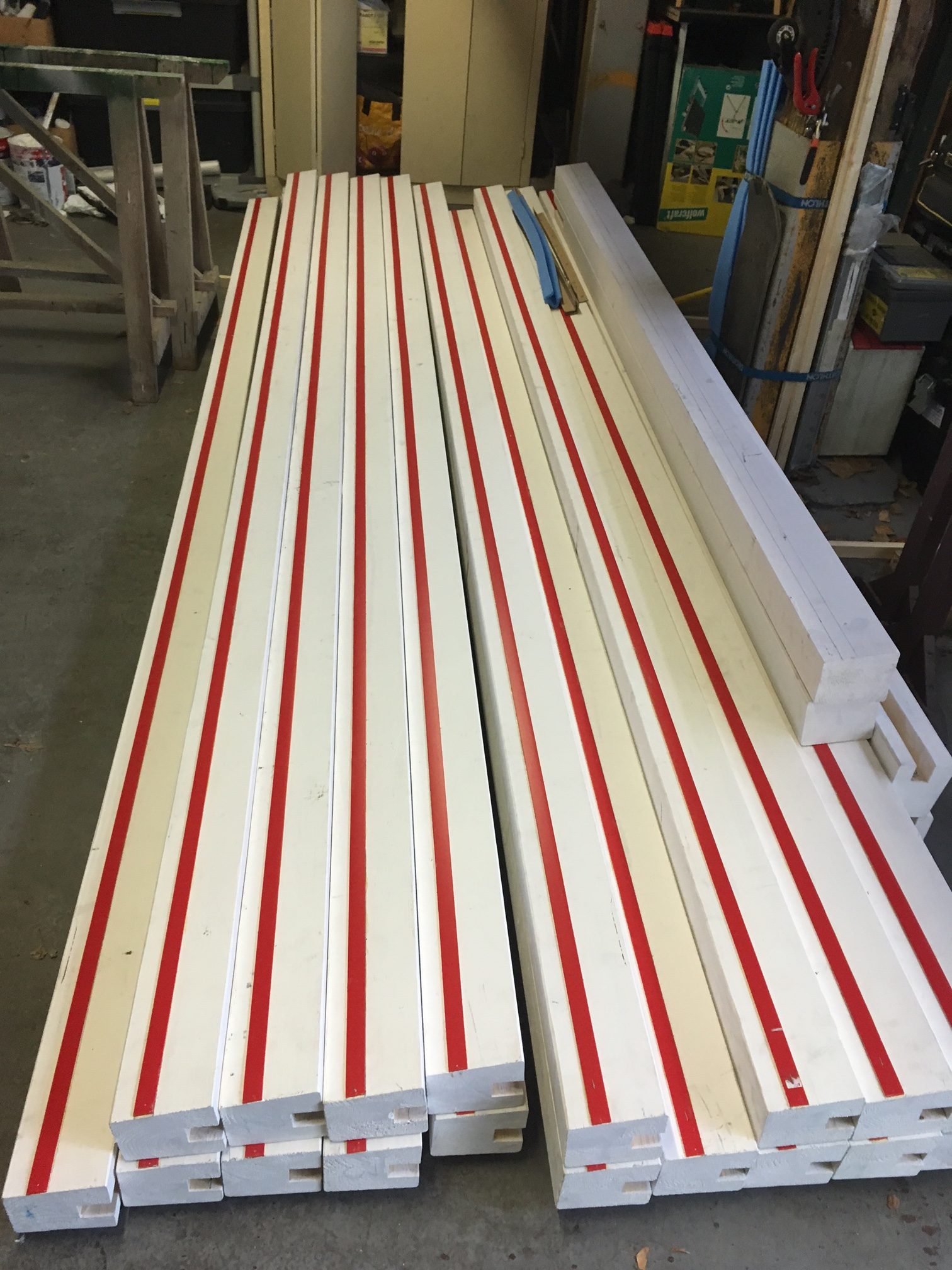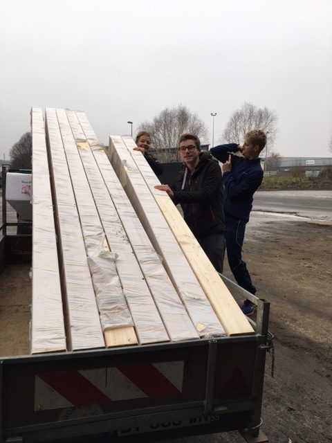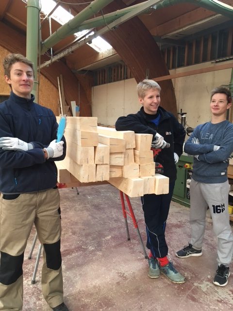 Les U19 (plus costauds!) ont acheminé le bois brut, assisté les menuisiers dans les découpes des bandes et clavettes (partie qui permet la liaison entre deux bandes) et apposé la peinture.